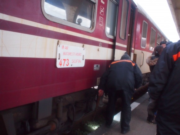 ルセの駅からブルガリア国鉄の範囲なので、車輪を叩いてひとつひとつ点検作業。