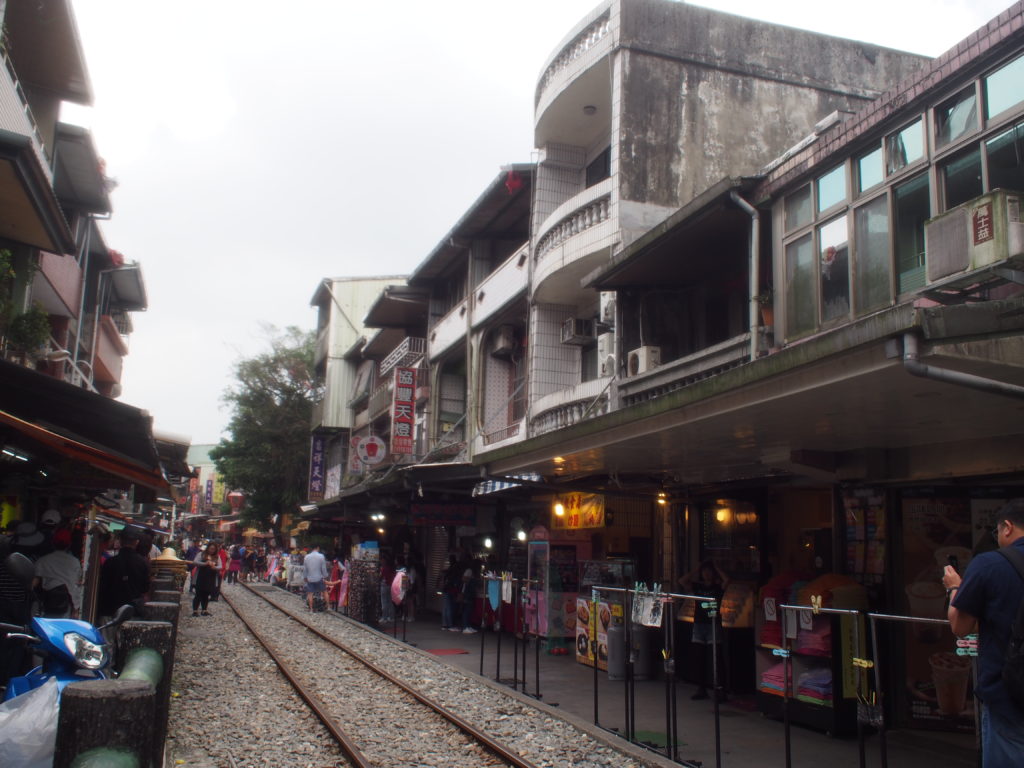 十分はこの狭い建物の間に電車が通る光景が有名。電車の本数は少ないので、普段は人が行き交う。