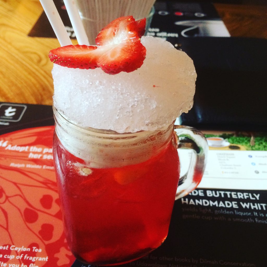 アイスドリンクの種類も豊富。ストロベリーフレーバー。あつーいスリランカなので、冷たい紅茶も飲みたくなる。