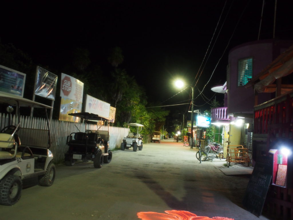 お昼も食べてないしお腹も空いたので、食べ物目指して宿の近くをお散歩。キーカーカーでは車ではなく、ゴルフカートが移動手段らしい。タクシーがわりに使うらしいけど、大きくない島なので徒歩でも行けそう。