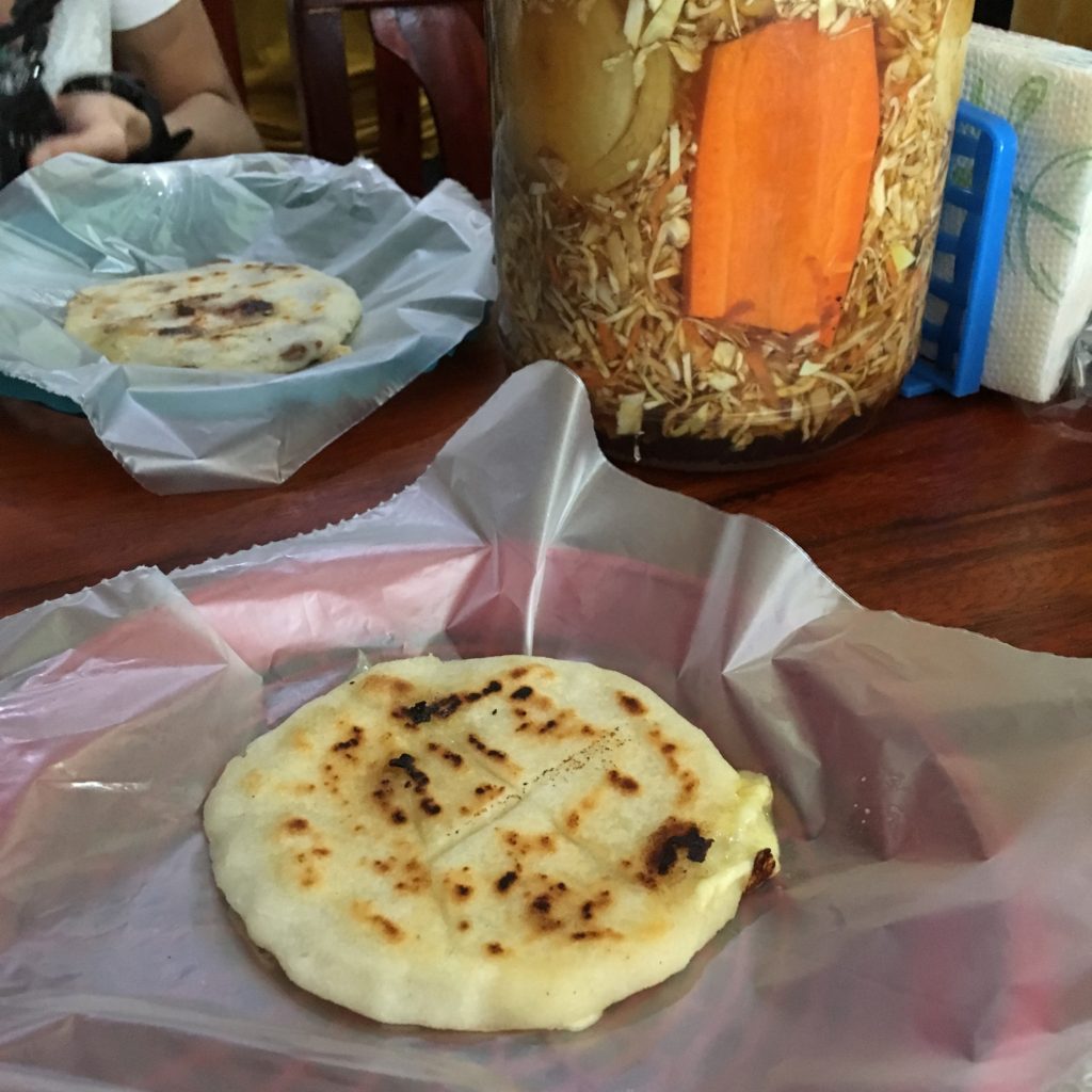 エルサルバドル名物ププサ。トウモロコシの生地のお好み焼きみたいなもの。トッピングが選べるので、チーズ&オニオンにしました。