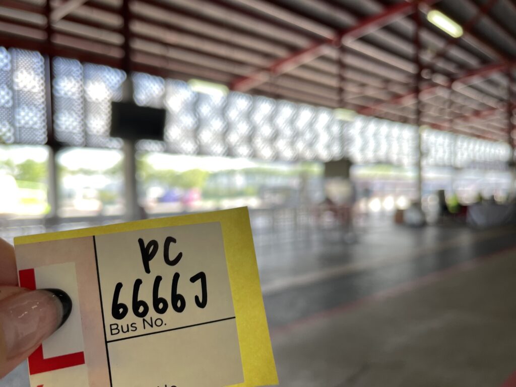 係の人に聞いたら、次のバスに乗れば良いよーと。さっきのバスで貰ったシールが乗車券がわりとのこと。