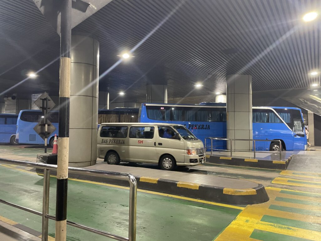 マレーシアとシンガポールの国境の橋コーズウェイを渡るバス。青と黄色のバスがあって、青の方が安いけど現金払いのみ。1ドル。