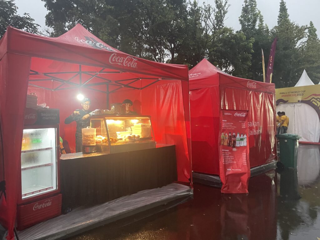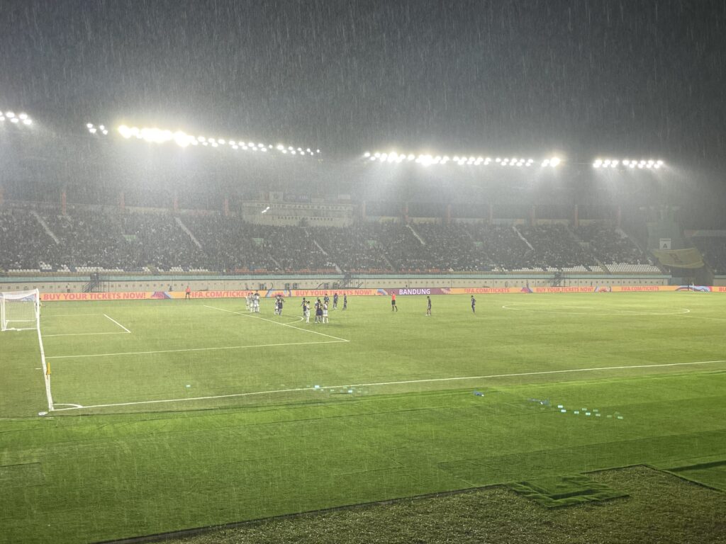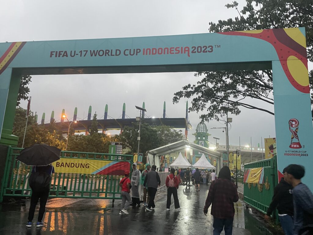 そんな雨の中サッカーを見る狂った人たちがこんなにいる。インドネシアすごいな。