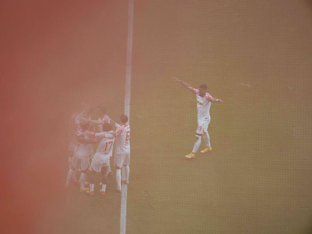 ハーフタイムにライプツィヒサポーターが発煙筒を炊き始め、ちょうど煙が出てきたところで得点。得点シーン見れました???