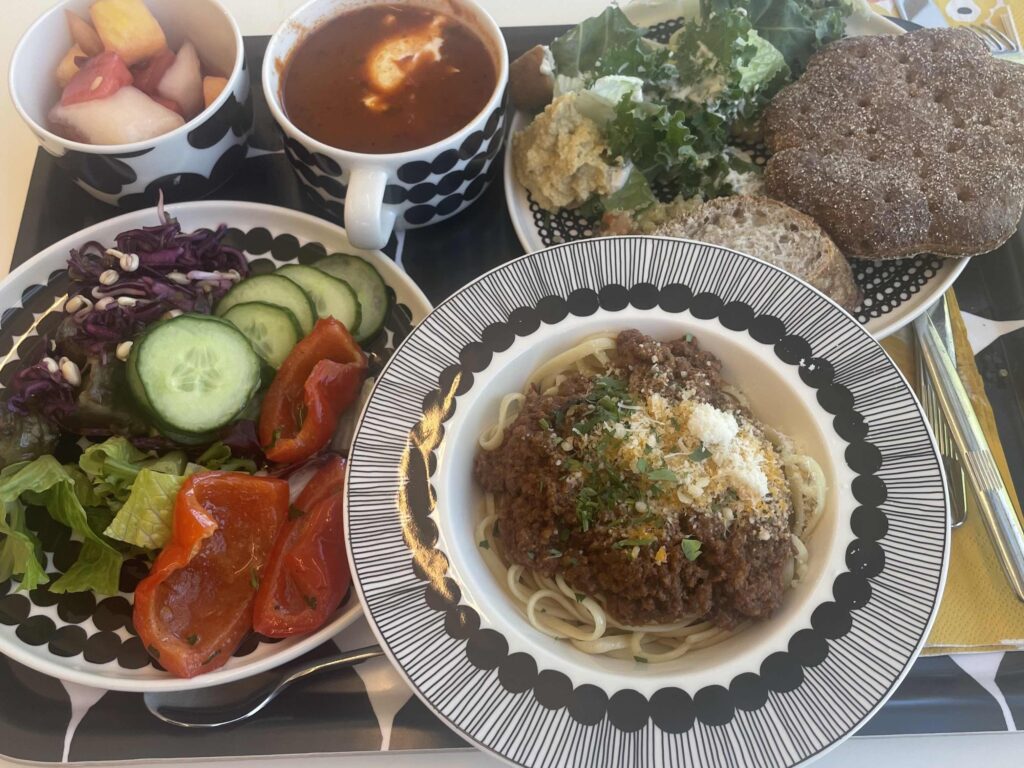 マリメッコ本社の社食maritoriでランチ。我ながらとりすぎた!食器はもちろんマリメッコで、サラダたくさんのメニュー。ボリュームいっぱいで大満足。飲み物も豊富。