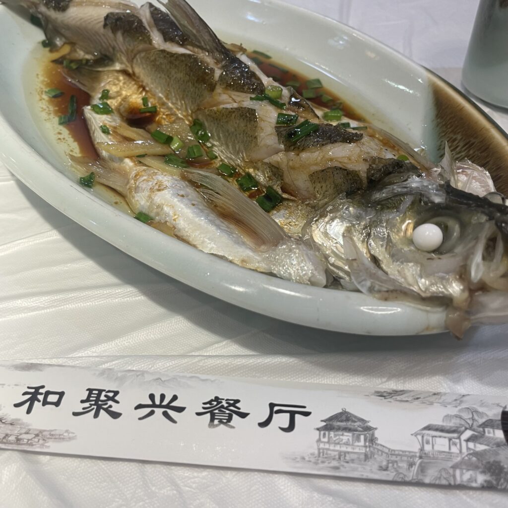 レストランにて。名物はなに?と言ったらこの白身魚をオススメされた。意外と食べやすい。
