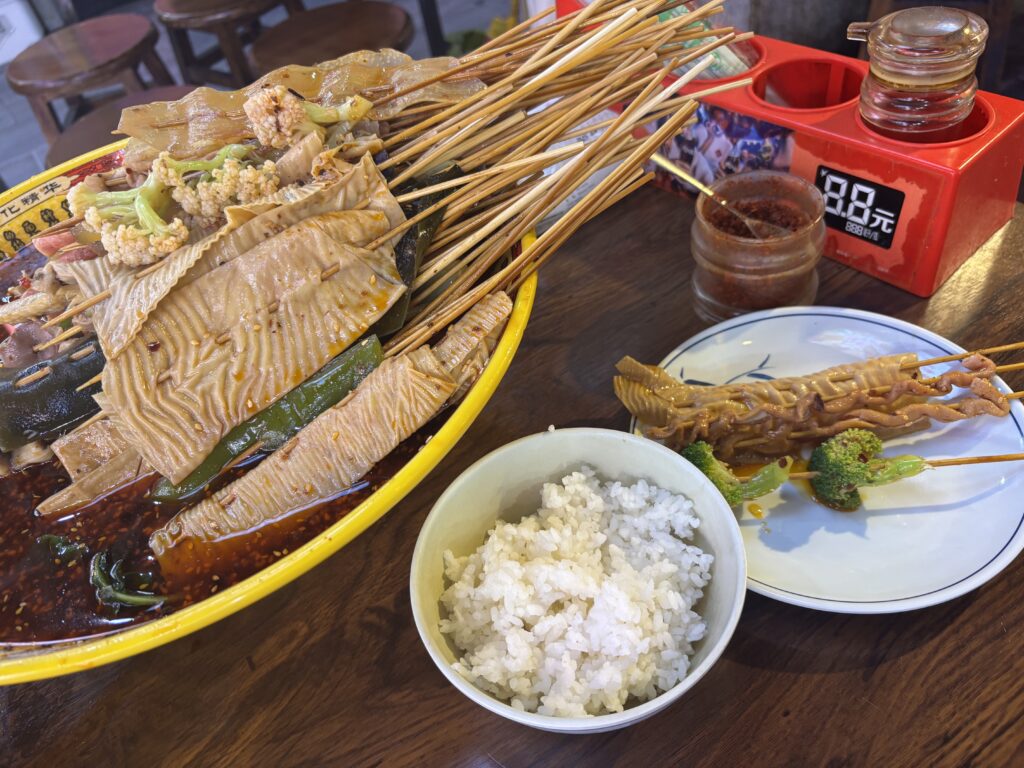 テーブルに着くと、ご飯を渡されて、テーブル上の鍋から好きな串を取って食べる。ちなみにスープは冷たいけど辛い。野菜や海鮮もあって選ぶのが楽しかった。