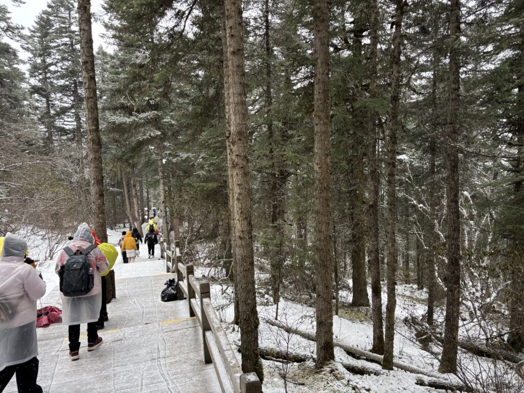 雪で滑るため、黄龍上寺まで1時間ほどかけて歩いてきた。この辺りでバス組と合流。