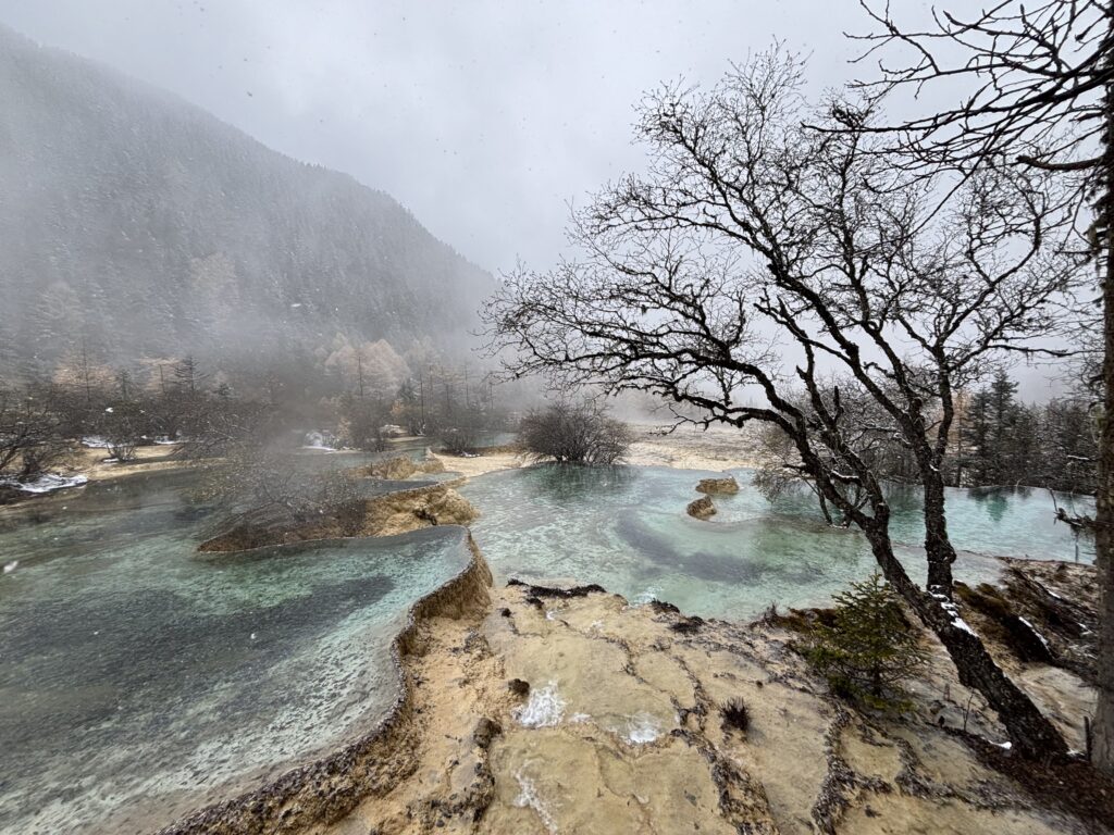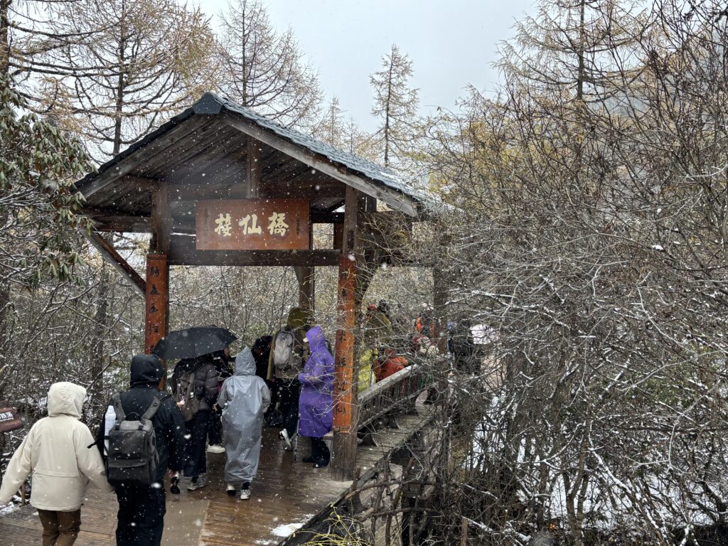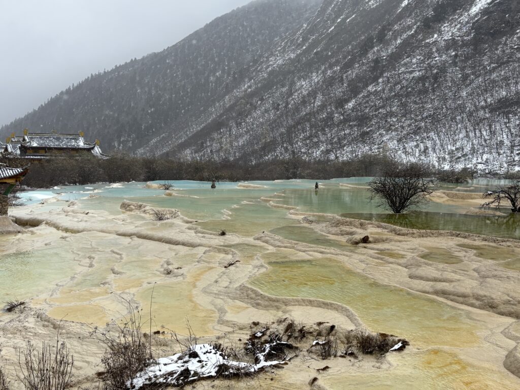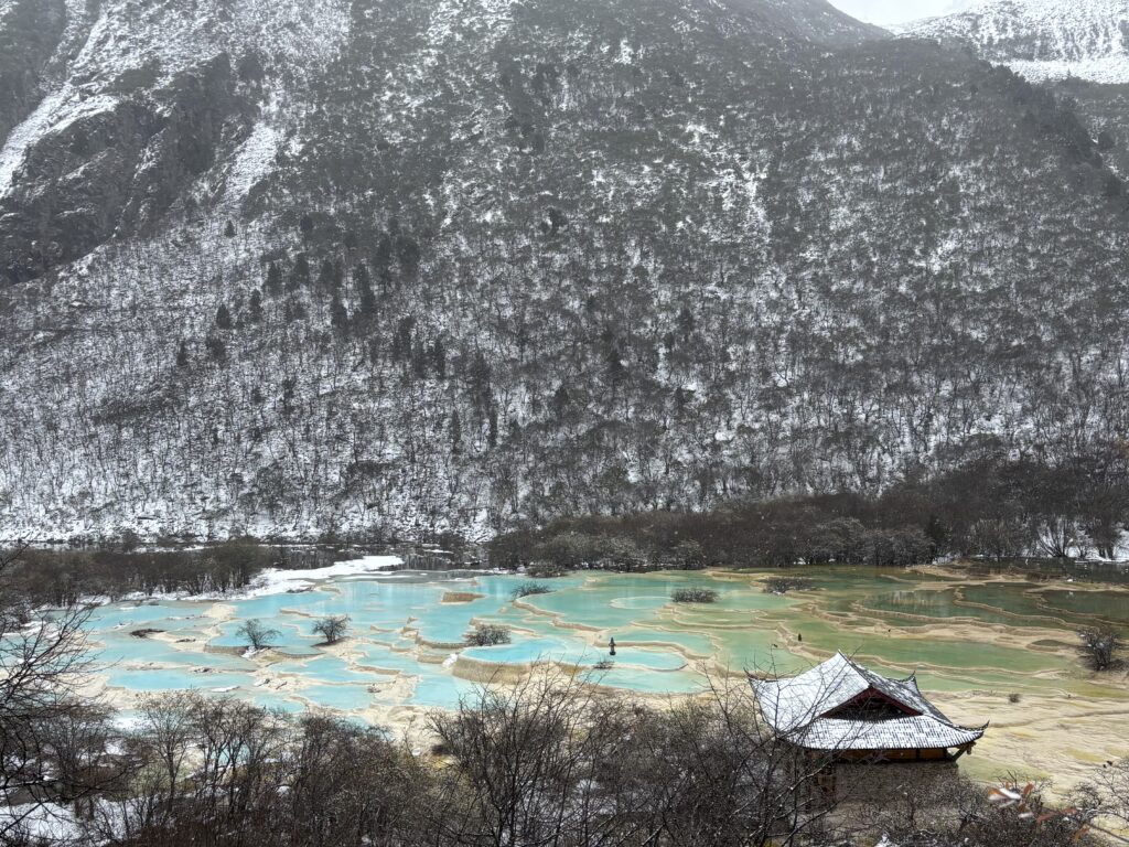 黄龍渓谷の遊歩道にある桟仏橋。中華風の建物と雪景色は似合うね。
