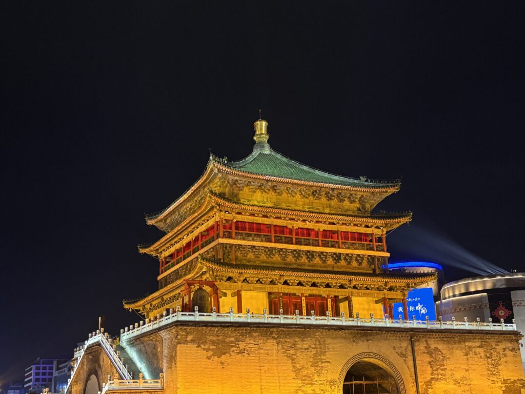宿に荷物を置いたら散策開始。西安の街は城壁に囲まれているけど、その中心にあるのが鐘楼。道路の真ん中にあったので、遠くから見るだけ。