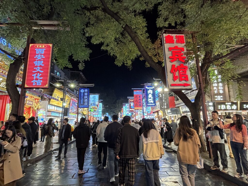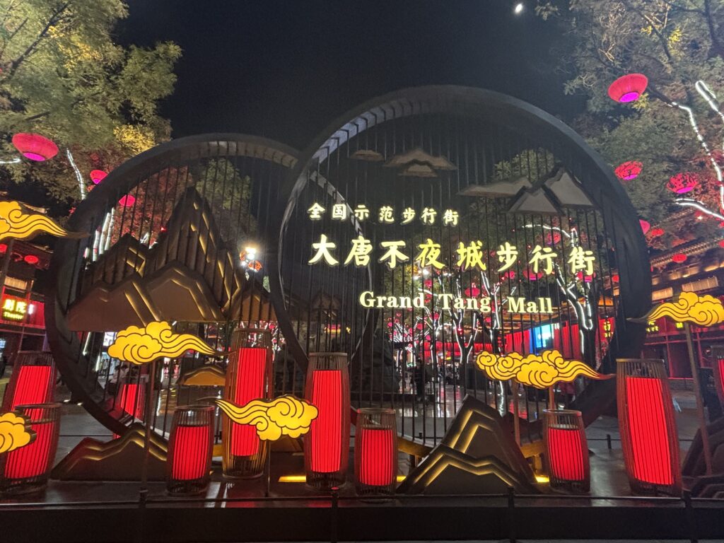 大雁不夜城歩行街。その名の通り、大通りが歩行者天国で飲食店や土産物屋が立ち並ぶ。