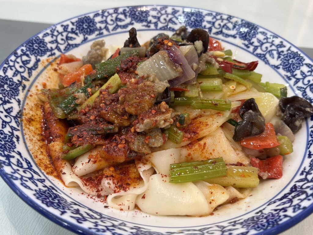 西安名物のビャンビャン麺!いやあ麺が太い。野菜も多く食べられてなかなか満足。