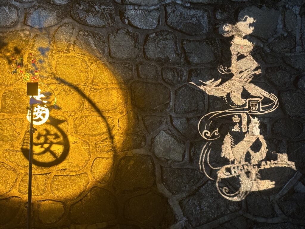 大雁塔周辺は夜にライトアップされるのだ。漢字のイルミネーションは新鮮!