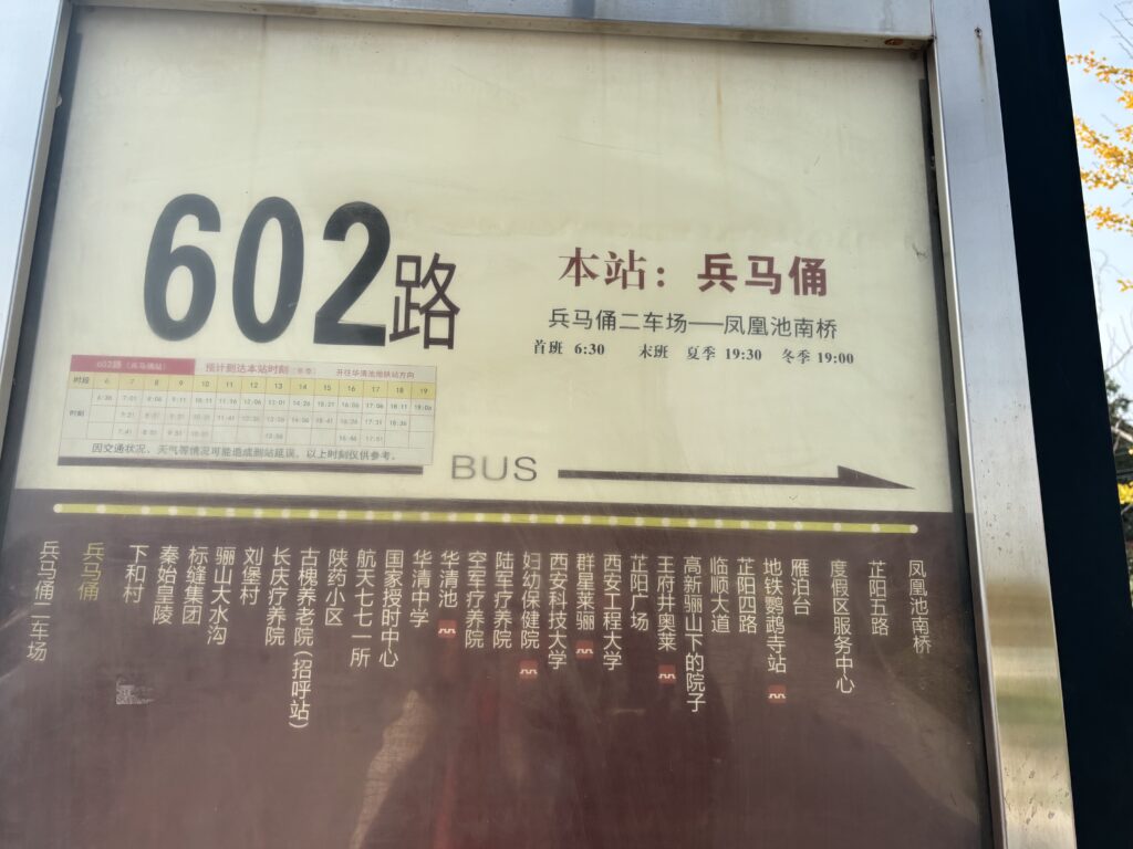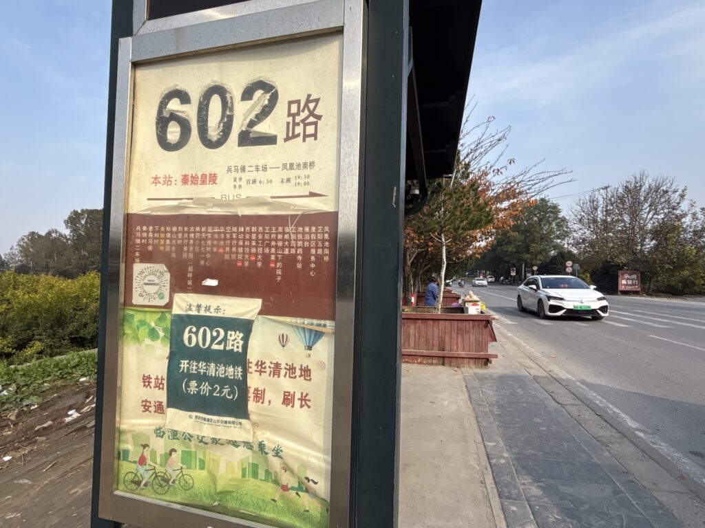 602路のバスが兵馬俑と秦始皇帝陵、地下鉄華清池駅を結んでいる。