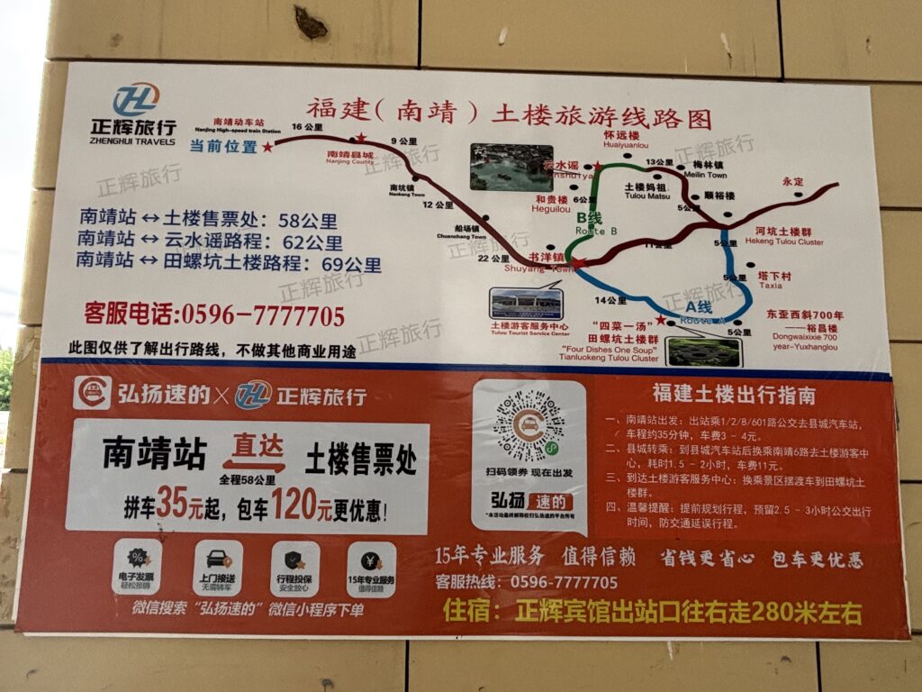 南靖駅を出るとすぐに客引きがいる!それを無視して福建土楼行きの公共バス乗り場の案内通りに進む。