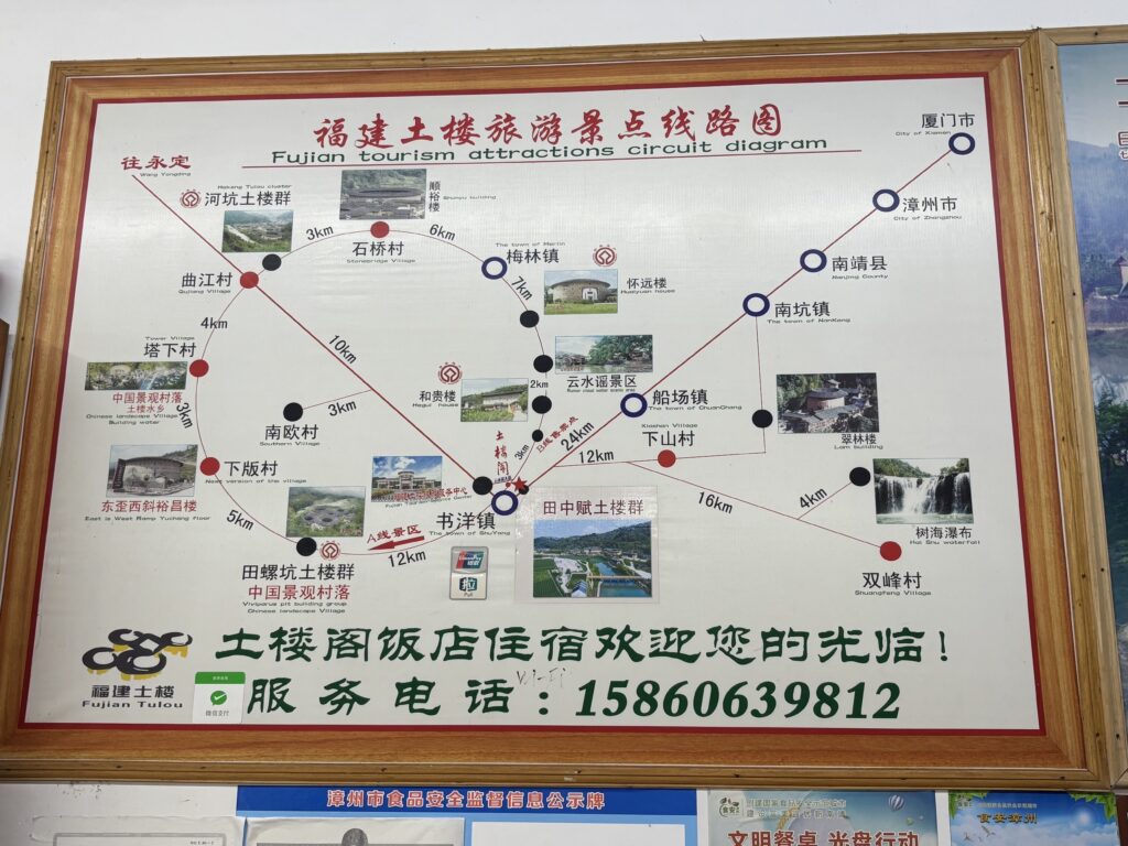 お昼を食べにレストランへ。店内にあった福建土楼の地図。