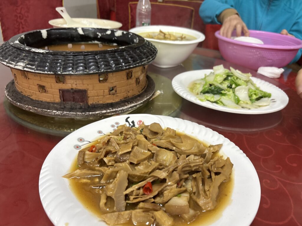 4人で食べ物をシェア。使わなかったけど、土楼の形をした鍋が良い!